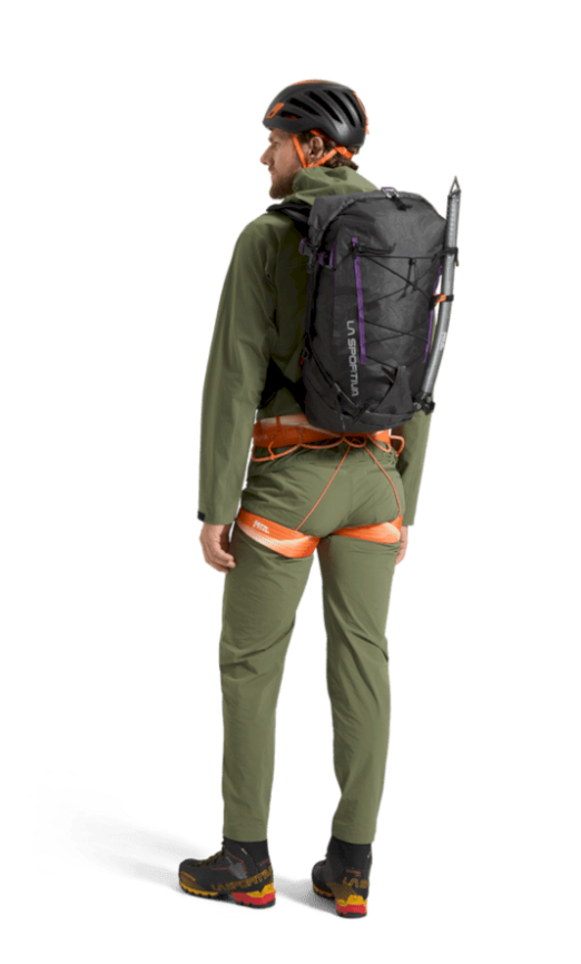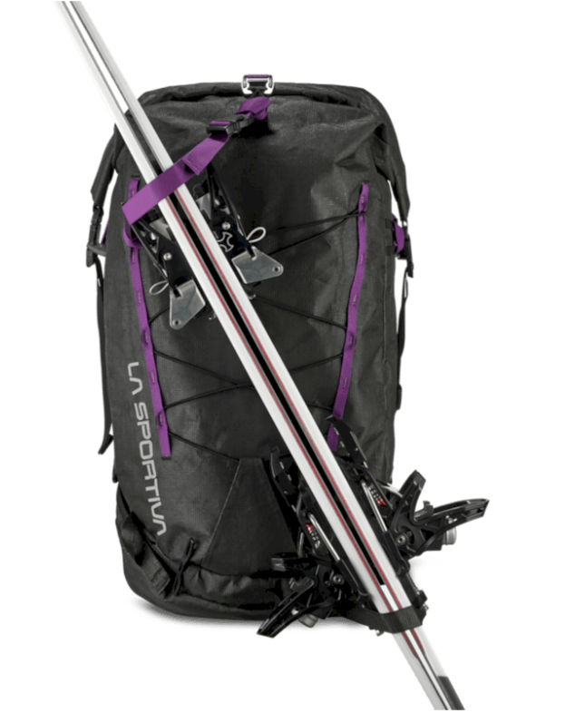 - Adjustable, removable front elastic cord, ice axe holders, compression strap and ski strap for A-frame or diagonal ski carry